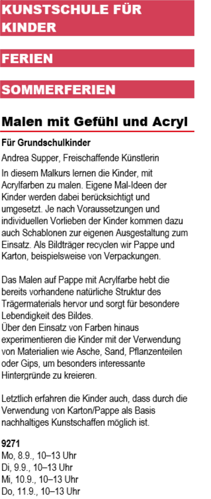 Andrea Supper ist jetzt Dozentin an der Kunstschule Filderstadt und wird 2025 in der letzten Sommerferien Woche ihr Projekt malen mit Kindern beginnen.